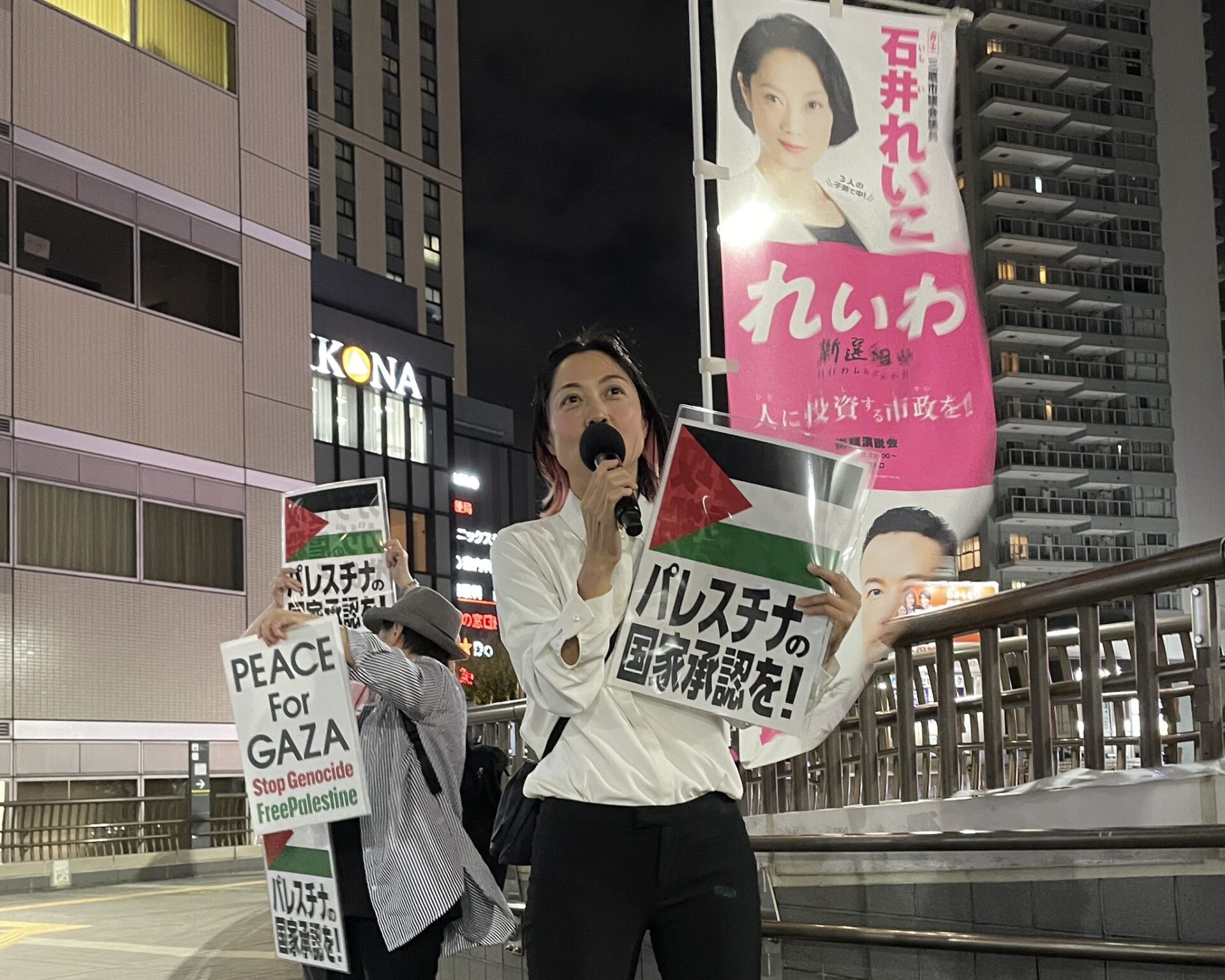 写真:三鷹駅にてパレスチナ・ガザのプラカードを持って仲間と街宣しました