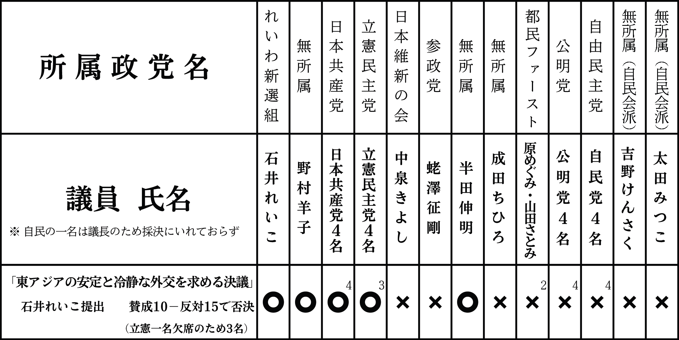 「東アジアの安定と冷静な外交を求める決議」(石井れいこ提出) 提出日:令和7年12月19日