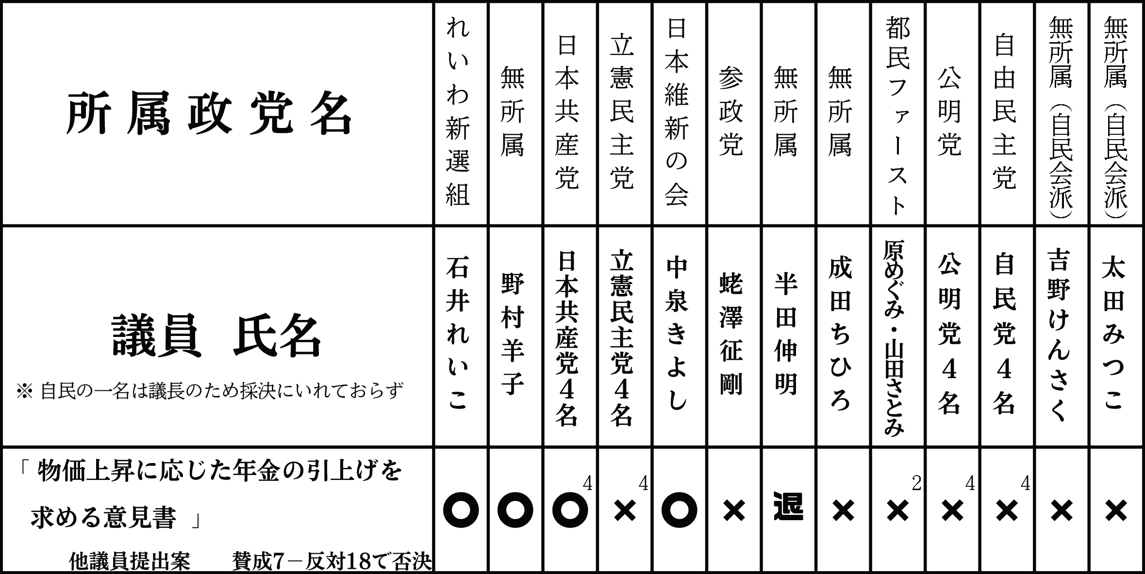物価上昇に対応した年金の引上げを求める意見書は、賛成少数となりました。しかし、食料品や光熱費の値上がりが続く中、「 年金だけが実態に追いついていない… 」と感じている声は多く聞かれます。