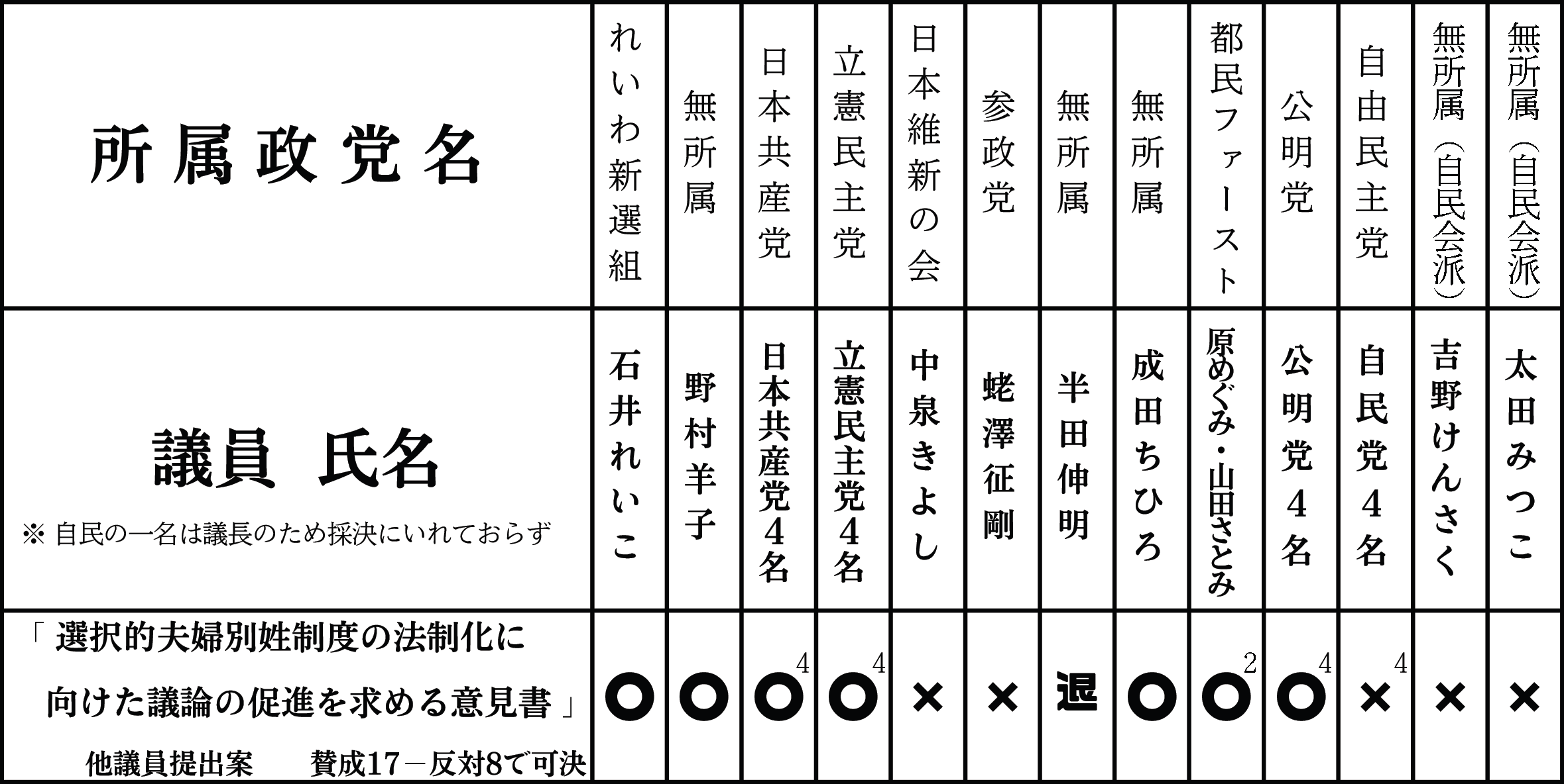 選択的夫婦別姓制度の法制化を求める意見書は賛成多数で採択されました。結婚や離婚、仕事や子育ての場面で、名前をめぐる不便や不利益を感じてきた人は少なくありません。
